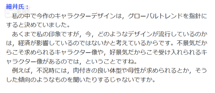 “虽然只是我的个人印象,但我认为当前流行的设计很可能受到经济情况的影响。经济不景气时某些角色形象更受青睐,而经济繁荣时又会有另一类角色形象更受欢迎。比如,我们经常听说,在经济低迷时期,人们更倾向于体态丰满或富有母性特质的角色,这似乎也是一种趋势。”