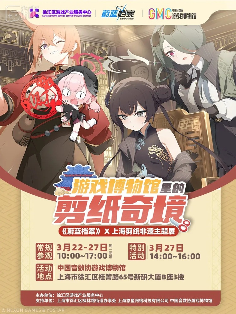 3月22日-27日,徐汇区游戏产业服务中心也将联合多方,在中国音数协游戏博物馆举办“游戏博物馆里的剪纸奇境:《蔚蓝档案》 × 上海剪纸非遗主题展”,精心呈现来自于国家级非物质文化遗产代表性项目“上海剪纸”保护单位——徐汇枫林剪纸团队的集体创作。