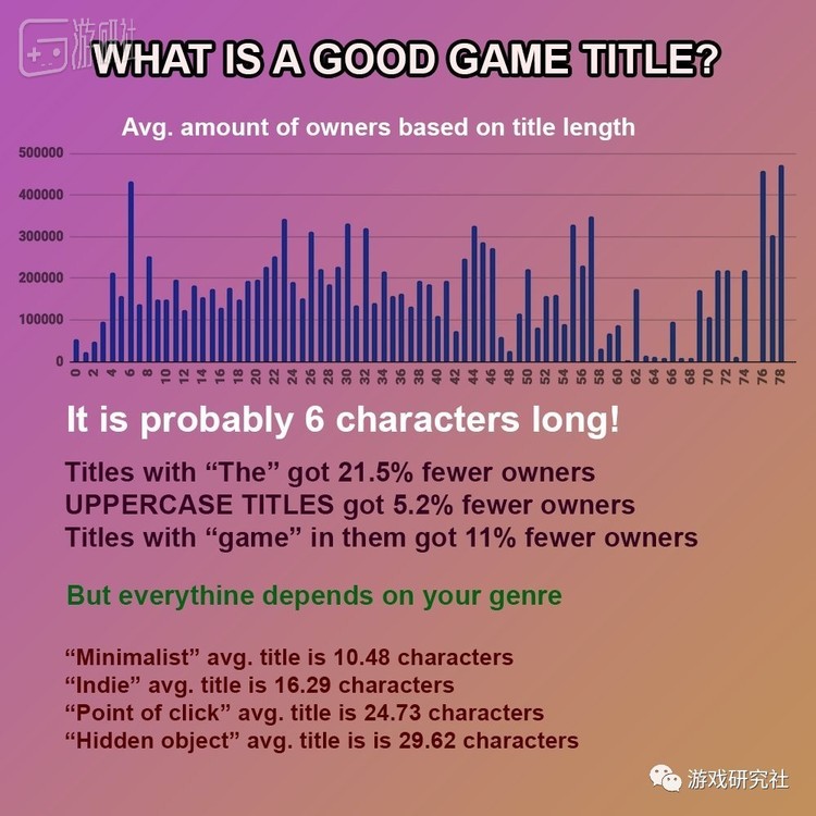 当然,Garbos也说了,究竟怎样取名还得看你游戏的类型:带有“极简主义”标签的游戏平均标题长度为10.48个字符;“独立”游戏的平均标题长度为16.29个字符;“点击”类游戏的平均标题长度为24.73个字符;而“隐藏物件”类游戏的平均标题长度为29.62个字符。