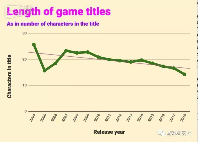 开发者Tim Garbos近期根据第三方Steam统计网站SteamSpy的数据,做了一个小统计。他发现,Steam上游戏名字的平均长度已经从2004年的25.7个字符下降到2017年的16.6个字符。想想也是,名字越短越容易被人记住。