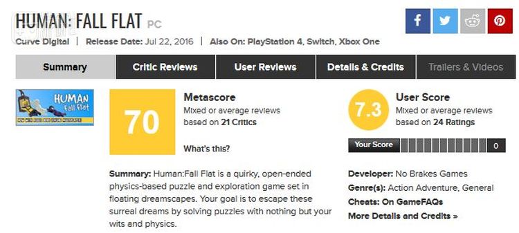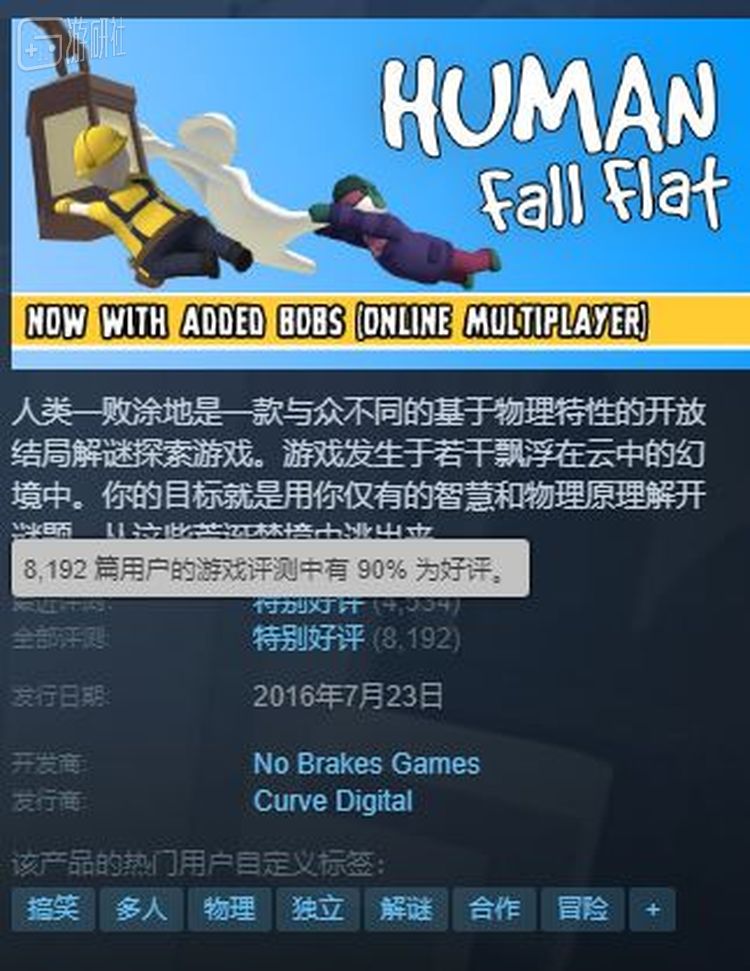 事实上,《人类一败涂地》已经发售了一年多,销量和口碑一直都不温不火。在Metacritic上的玩家评分为7.3。这虽然不算低分,但口碑显然比不上steam上90%的好评率。