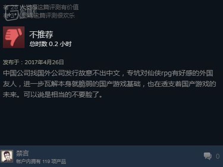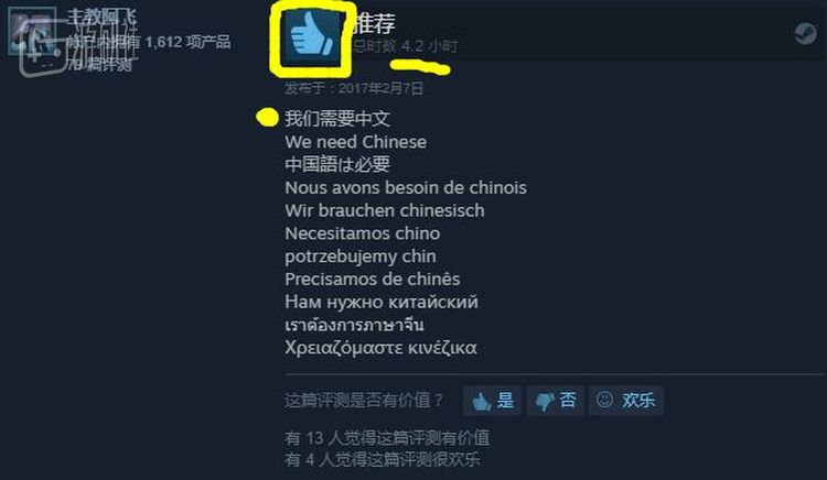 说一个小插曲。喜欢在非中文游戏评论区里请求中文的中国玩家,很多人的原则都是“无中文,就差评”,但在这里却有人非常慷慨的给了好评。