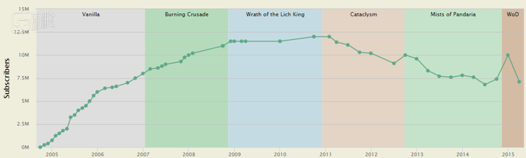 MMO-Champion曾经根据暴雪官方公布的数据制作了一个《魔兽世界》付费玩家数的表格,可以清晰地看到《魔兽世界》的玩家变化趋势: