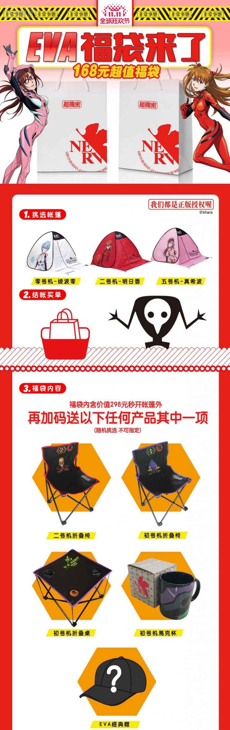 首先,我社淘宝店将于11月1日 至 11月15日推出EVA正版授权超值福袋:内含价值298元的凌波丽/明日香/真希波三种帐篷三选一,再加送随机折叠椅/折叠桌/马克杯/经典帽一件,福袋售价仅168元,详情请点击此处,也可见下图!