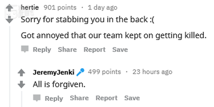 有些不和谐的是,就在大部分人停战之时,少数玩家依然在继续作战。其中一位玩家从背后袭击了正在录制视频的JeremyJenki。不过,该名玩家得知此事之后已经出面表示道歉,他说:“很抱歉在背后捅了你一刀:(当时有人还在杀我的队友们,这让我有点恼火。”他也已经得到了JeremyJenki的谅解。