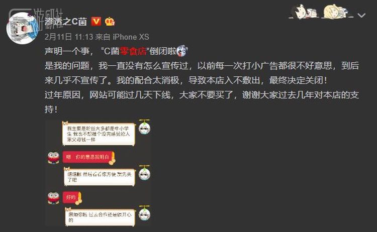 今年2月,C君发了条微博,宣布“C菌零食店”正式倒闭,原因是C君自己没怎么打过广告,零食店销量低迷,C君和合作方解释:“我主要粉丝大多都是中小学生,我也不想推个没完,感觉抢人家父母钱一样。”