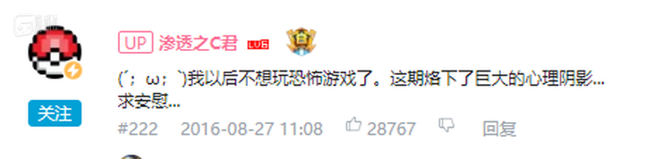 视频上传后,C君给自己评论:“我以后不想玩恐怖游戏了。这期烙下了巨大的心理阴影”。