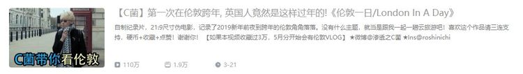 这期视频里,C君记录自己在伦敦新年夜的所见所闻。不难看出的是,视频制作经过了制作者的仔细打磨,构图规范,分镜讲究——C君为此自学了几个月电影拍摄技巧。
