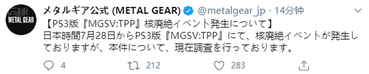 目前,《合金装备》的官推表示正在调查这次“无核化”事件。或许,Snake最后说的那句“我以为这天永远不会到来”,真的要到来了。