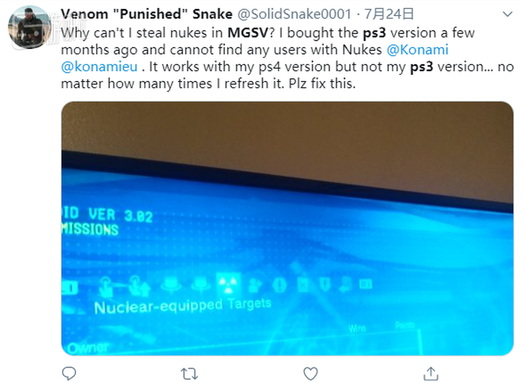 “7/27 21:36”这说明动画是在两天前被触发的,根据作者的介绍,这段视频是出自“PS3”版本的游戏,而几天前推特上就曾有PS3玩家表示“已经找不到带有核弹的玩家基地了”。