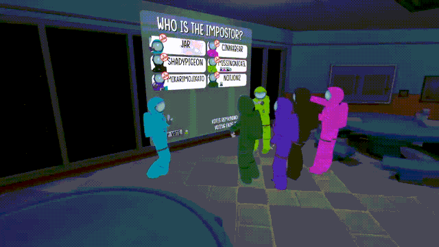 借由这款自由度极高的社交游戏,一名叫Jar的玩家将正在红极一时的狼人杀游戏《Among Us》做进了《VR Chat》里。